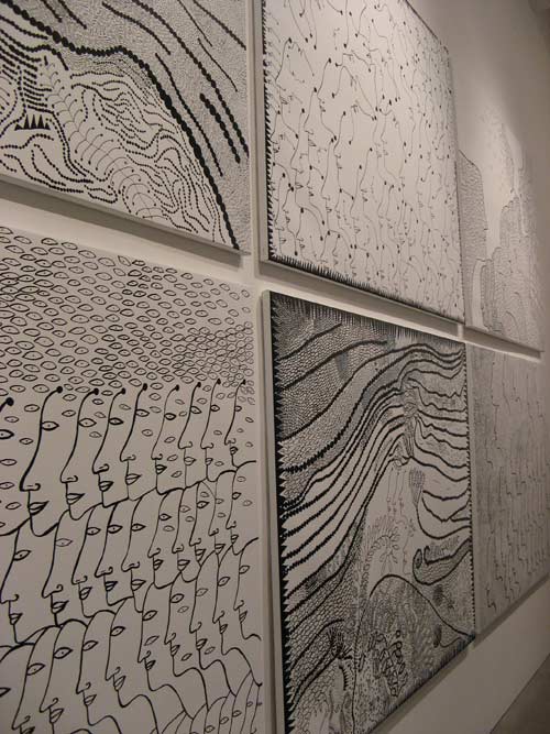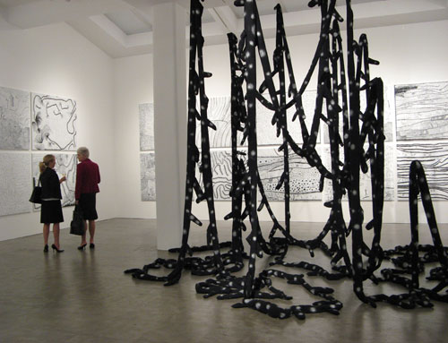 Kusama’s “infinty net” works were unsettling in their density; her 2006 largescale installation, “Black Nerve” (first photo, above) reminded me of a droopy set piece out of Little Shop of Horrors.