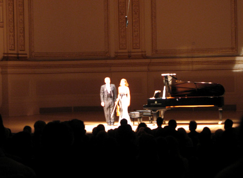 So we were back at Carnegie Hall for the second of German violinist Anne-Sophie Mutter‘s three all-Mozart programs. In honor of Wolfgang Amadeus Mozart’s 250th birthday, Mutter launched Das Mutter Mozart Projekt — an ambitious series of four new Deutsche Grammophon CDs containing all of Mozart’s major compositions for violin. To complement and promote the recordings, Mutter and her accompanist Lambert Orkis have been performing Mozart recitals all over Asia and Europe. This month, they conclude their tour in the United States, with concerts in St. Paul, Chicago, Boston, New York and Washington, D.C.
