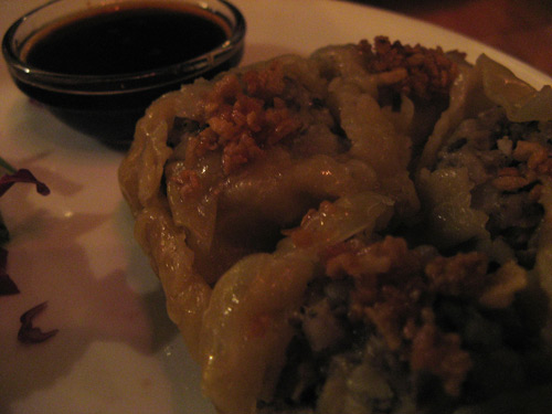 Another Carnegie Hall concert. This time, SYB and I decided to forego the usual pre-concert trip to Burger Joint in favor of something different. After weighing the alternatives, we settled on Pam Real Thai. SYB had never been there — which was a bit surprising since I’ve eaten there about half a dozen times in the last few months — so he was looking forward to making the Thai taste comparison. We arrived just before the dinner rush, and quickly decided upon Fried Tofu, Steamed Chive Dumplings and the Pad Key Mao (stir-fried flat noodle with beef, chili, basil and garlic, which we decided would be our baseline of comparison.) And of course, our flame-quenching Thai iced tea and coffee.