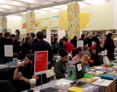 Hit the inaugural New York Art Book Fair, the city’s first-ever fair devoted to contemporary art books and artists’ books, with 2 floors showcasing 70+ exhibitors from around the world: from mainstream and overseas distributors to antiquarian dealers to a section called “Friendly Fire” devoted to zines, artists and other independent publishers. The event was held at a gallery in West Chelsea, in the former Dia Art Foundation space. Judging from the very healthy turnout, independent book publishing is alive and well. The event was organized by Printed Matter, the world’s largest non-profit organization dedicated to the promotion of publications made by artists.