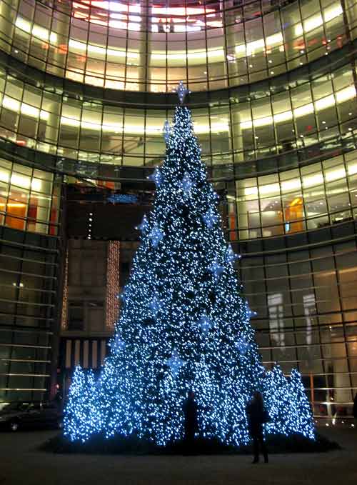 Christmas tree inside the central glass-coned courtyard of the Bloomberg Building at 731 Lexington-One Beacon Court. The mixed-use 53-story tower was completed for $630 million in 2004 on the site of the former Alexander’s department store. It was designed by Cesar Pelli & Associates, the architect behind the Petronas Twin Towers in Kuala Lumpur, and in New York City, the World Financial Center, the Carnegie Hall Tower and the Museum Tower condominiums adjacent to the MoMA.