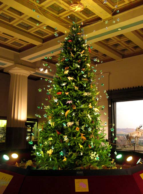The 34th annual Origami Holiday Tree at the American Museum of Natural History, which will be on display through January 1 on the first floor Theodore Roosevelt Memorial Hall. This year’s theme, “Origami Safari,” showcases a teeming jungle of paper lions and tigers and bears… zebras, rhinos, giraffes and one pink elephant.