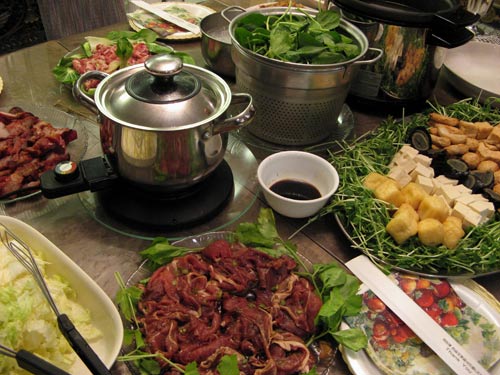 The meal is sometimes eaten as part of the traditional Chinese New Year feast, and is especially welcome during the winter weeks, even unseasonably warm ones. The entire endeavor is a leisurely, interactive event; the roundness of the pot symbolizes unity, as family and friends gather around to cook and to share. After the meal, what remains is the broth, richly flavored with all the ingredients of the dinner. And in our case: lots and lots of leftovers to be distributed and packaged for the “kids” to take to their respective homes.