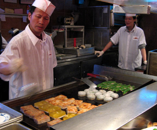 Also: a griddle station with shrimp paste-stuffed japalenos (much hotter than I expected!), turnip, taro and sweet water-chestnut cakes, and chive dumplings.