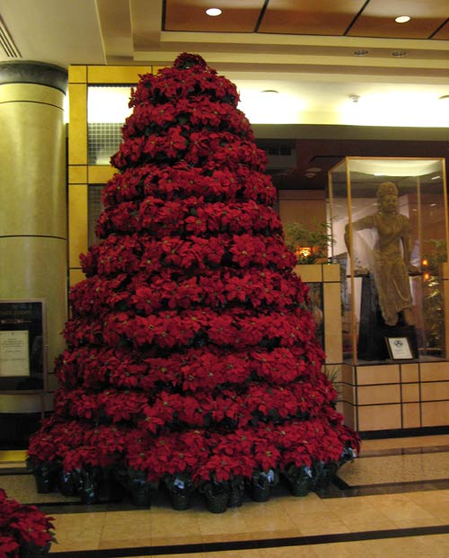 Inside the lobby of the Sheraton LaGuardia East Hotel: a Poinsettia “Tree”, constructed of dozens of tiered pots. The red-leafed plant is native to Mexico and Central America, and named for Joel Roberts Poinsett, who introduced it to American floriculture during his tenure as the first United States ambassador to Mexico in the 1820s. The plant’s name is one often plagued by beastly mispronunciations. I’ve heard “poyn-setta” and (inexplicably) “point setter,” which sounds like it should be a piece of fencing equipment or some kind of hunting dog. The latter malapropism is so common that if you plug “point setter” into Google, the search will return “Did you mean: poinsettia”?