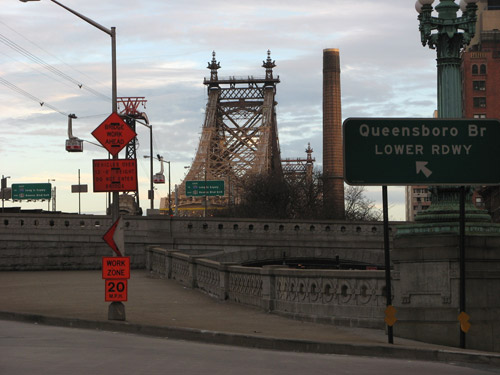 By the time I arrived in midtown for the Little Miss Sunshine screening, the ticketholders line had stretched East to the entrance of the Queensboro Bridge, an optimal (if chilly) vantage point for the Roosevelt Island trams, making their 4.5 minute rides over the East River.