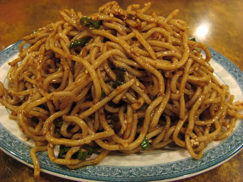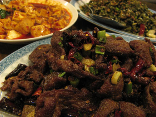 Beads of sweat formed on SYB’s brow, but he seemed to relish the food, which was, yes, very spicy and very tasty. The layered combinations of dried and fresh chilis, rice wine vinegar, sesame and chili oils, Sichuan and black peppercorns, scallions, ginger and garlic set our eyes and noses watering and tongues afire.