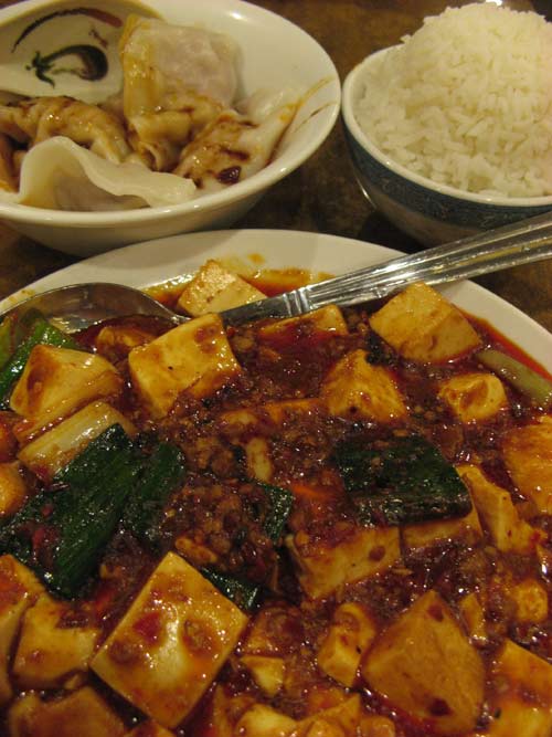 We could easily have made a meal of the cold offerings, but once seated, we decided to focus on the main dishes. Our meal began tamely with the Sesame Cold Noodles (which for once didn’t taste suspiciously of Skippy peanut butter) and the Steamed Dumplings in Red Chili Sauce. Soon, the other dishes began arriving, raising the heat level significantly. The Bean Curd Home Style (Ma Po Doufu), swimming in red-hot chili oil, Lamb with Chili Pepper (lots and lots of chili pepper) and Chinese String Bean with Minced Pork. We ran out of room on the two-top table! After some plate juggling, the server moved us to another, larger space across the room.