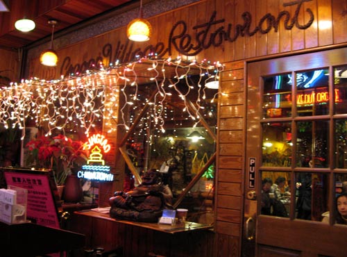 Back at Congee Village for a some pre-play dining. PD and I were waiting in the bar area when SC & JG raced in from their busy day of home hunting. With our entire party accounted for, the hostess seated us in the mezzanine dining room: all exposed brick and bamboo.
