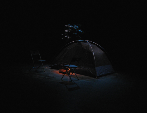 The darkened stage stood barren of all accoutrements except for a tent and a couple of folding chairs. A boombox emitted loud cricket sounds as two unidentified, unremarkably dressed, 40-ish women entered the stage separately and just… sat there. For what felt like an eternity, they sat facing each other, immobile, staring, not staring. At last, one spoke. Their clipped exchange was heavy with pauses and carried the tense undertones of estranged lovers. Which we couldn’t entirely be sure they were. My heart sank just a little as I braced myself for a lo-o-o-ong night.