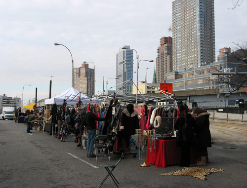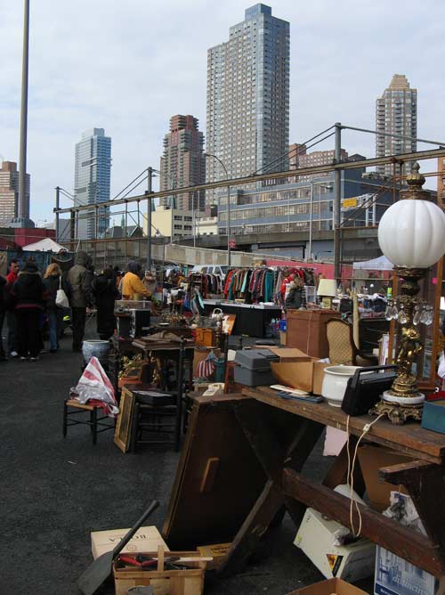 The Hell’s Kitchen Flea Market launched the first weekend of August 2005, in the still sketchy shadow of the Port Authority, at the mouth of the Lincoln Tunnel. In warmer weather, the Annex features up to 170 vendors, and a $1 shuttle service runs between here and the other flea markets in Chelsea every Saturday and Sunday from 10 am to 6 pm; in the grey chill of late January, the number of stands is far lower, and the surroundings more desolate.