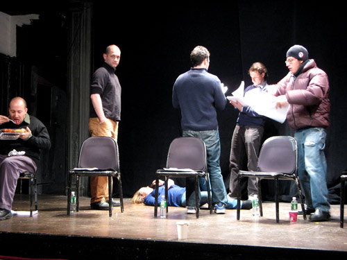 We took our seats early, which afforded us the opportunity to observe the players before showtime: one lounging on the floor stage right, another scarfing down his dinner, the others taking last minute notes from director Lou Moreno and playwright Sam Marks. Fellow alum GK was in the ensemble again, and in fine form, playing a character slightly less unbalanced than the last time. Slightly.