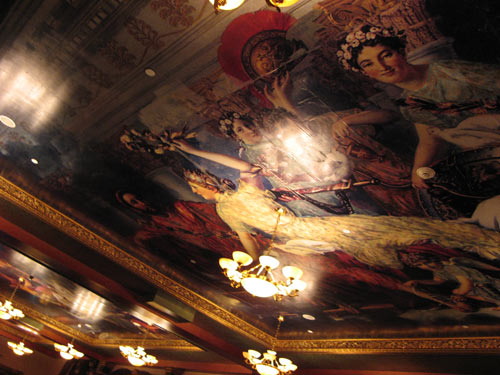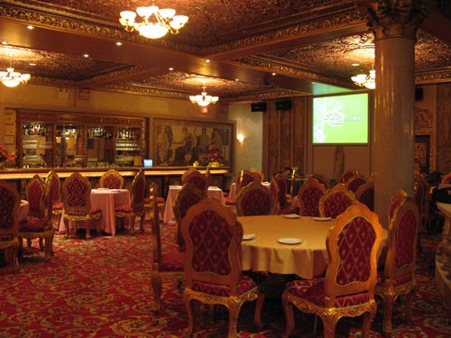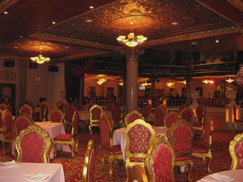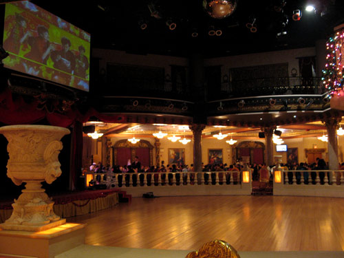 Inside was a gold-red explosion of faux tapestries, gilt-framed “paintings,” granite pillars, pasted-on ceiling “murals,” hollow resin-cast statues and urns… and the pièce de résistance, a disco-balled dance floor, over which perched a huge projection screen and Juliet terraces strung with multi-colored Christmas lights.