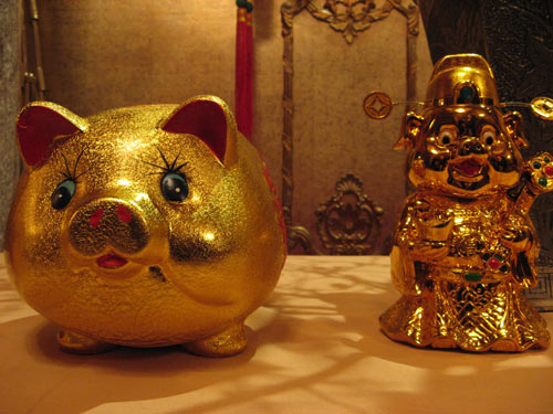 The over-the-top décor, though, was incidental to our lunch, and if nothing else, it served as a topic for animated table conversation. Together, we toasted in the Year of the Pig with dimsum (which was fine, but pricy) and J’s favorite nian gao — Chinese New Year sticky cakes.