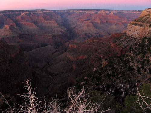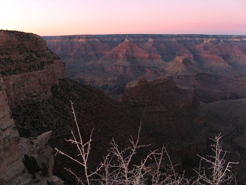 J’s flight into town — unlike mine — came in on schedule, so after I retrieved her at the airport, we were off. Grand Canyon, here we come! The four-hour drive north brought us through the Sonoran desert, deep into a landscape that changed from cacti and brush to snow-capped mountains.
