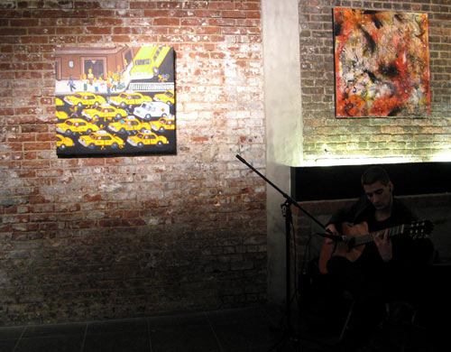 The pieces are presented in a “chamber” format: small galleries, intimate spaces. In the main space, the tunes of jazz guitarist Darius Melendez mingled with the multi-lingual chatter as servers with trays of icy caipirinhas circled the room.