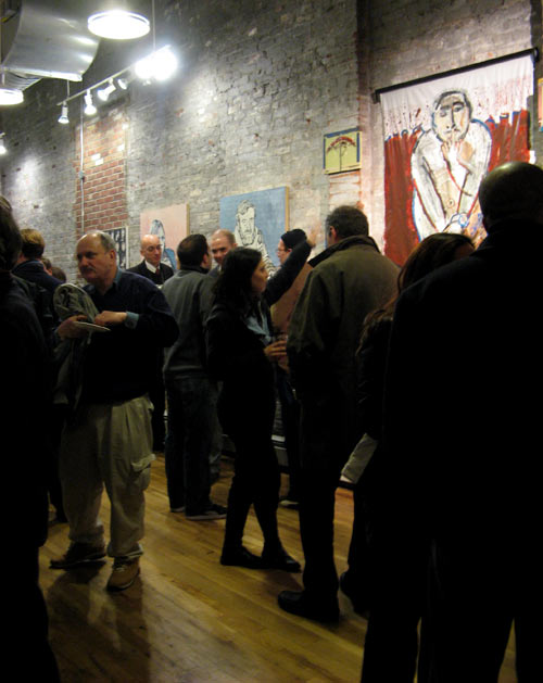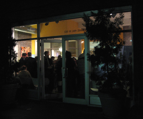 I headed west from Penn Station, and then just kept on walking… and walking… and walking. The pedestrian traffic thinned out as I approached the West Side Highway. By Tenth Avenue, the storefronts were mostly darkened warehouses — until there it was, across the street from the Copa, Copacabana (the hottest spot north of Havana): the Curb Art Space, tucked almost incongruously inside a leafy courtyard from which the tinkling sounds of the party could be heard.