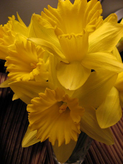 Daffodils, those cheery harbingers of Spring! A couple of days ago, on impulse, I plucked this bunch from a black plastic pail in front of the florist/dry cleaner in my neighborhood. (Yes, it really is both a florist and a dry cleaner.) The stems were just budding stalks then, but the cashier assured me that they would open up in time, and sure enough…