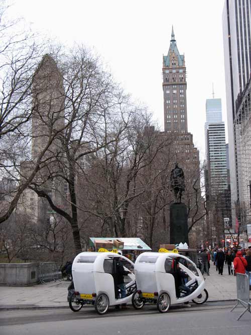 The detour home sent me through the park once more where I spied this pair of pedicab drivers taking a dirty water dog break against a backdrop of two of the most luxurious hotels in New York City.