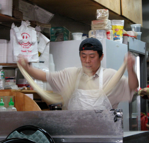 The Times Peter Meehan wrote up this little place in 2005, in a piece from which I lifted the title of this blog entry. Like him, we put in our order for bowls of beef with hand-pulled noodles and sat back to watch the show. A man — the owner, Lanzhou-trained Jianbin Gao — measured out a wad of dough and went to work, stretching and pulling the dough into increasingly thinner strands. The noodles twirled and flipped through the air in his expert hands, intermittently slapping against the floured counter. According to the Times, Gao and his wife opened the original noodle shop in 2001 to follow one they had operated for a decade in Fujian before moving to the United States.