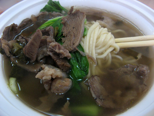 Gao made short work of the dough, after which his wife took over, dunking the noodles into a vat of broth deeper inside the kitchen, and topping our bowls with a pile of beef and greens. (White, take-out plastic dishware seems to be standard issue among these shops.) The texture of the noodles was delightful — firm and just chewy enough, as they would remain to the last strand. The soup broth was fine, too, but to my tastebuds, fell just short of the richness of Sheng Wang’s, for which we compensated with a generous — perhaps too generous — spoonful of chili oil from the table.