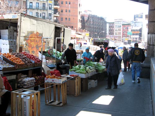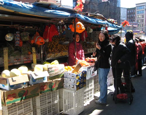 Terrific selection and perfectly ripe produce, at a fraction of the price it would command just a couple of subway stops uptown. Earlier this year, SYB clued me into a fascinating NPR feature investigating how it is that Chinatowns around the country are able to offer produce at prices so much lower than mainstream outlets – and in some cases, lower even than wholesale sources. The conclusion: shoppers in these areas typically buy produce more frequently, and primarily for use the same day, so only buy when the fruits and vegetables are at the point of ripeness, i.e., the very point at which the distributors are most desperate to unload their supply, and are therefore most willing to offer deep discounts. By contrast, larger-volume urban/suburban outlets (e.g., chain supermarkets) want produce with shelf life to allow for the largest window of salability. In addition, the larger chains need to maintain a more or less constant supply and variety of stock; smaller makeshift outlets like the street vendors are able to absorb last minute items and in smaller quantities, since they are generally not expected to maintain the same stock supply from day-to-day. Shopping this way requires more flexibility from the buyer, but the trade-off can be tremendous value.