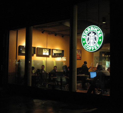 On the way home, the 24-hour Starbucks in my neighborhood. 1 in the morning on a Wednesday and not a free table in sight.