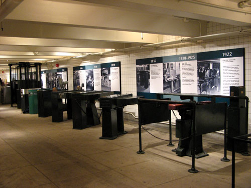 After perusing the collages on display, I turned to the century’s worth of memorabilia housed at the museum collection, among them a fascinating display of antique turnstiles devices used by the MTA through the years.