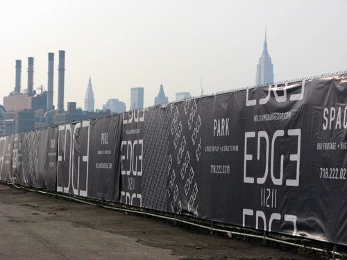 Our post-meal trip to the waterfront was thwarted by graphic-printed barriers erected around a huge construction site, soon to be the 892-unit Williamsburg Edge — “Sexy on the Outside + Beautiful on the Inside,” “The Hippest Dress Code + The Coolest Zip Code.”