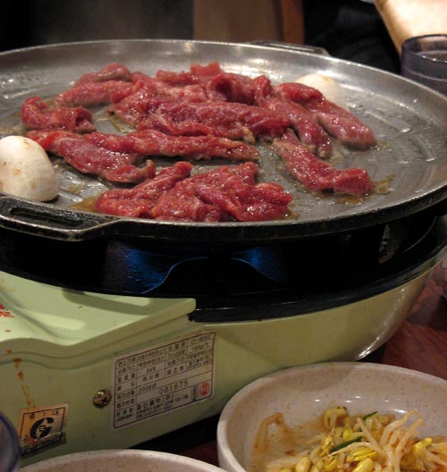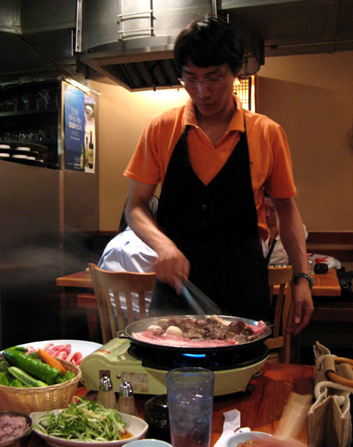 An order of “BBQ Combination for 2,” a.k.a. “Carnivore’s delight,” was made up of a heaping platter of fatty pork belly, thin sliced beef brisket, and ox tongue. To supplement, we could not resist adding on the Gal Bi Gui (marinated short ribs) and Bul Go Ki (marinated prime ribeye), all of which the restaurant staff helpfully grilled for us tableside. No smokeless grills this time out; the heavy scent of grilled meats permeated everything.