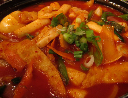 Rounding out the non-meat items: the Hae Mool Pajun (seafood pancake), the Chap Jae, a bowl of Soon Doo Boo Chigae, the Mae Woon Dduk Boki (spicy pan-fried Korean rice cake with vegetable — pictured below) and one curious-looking bowl of purple (forbidden?) rice.