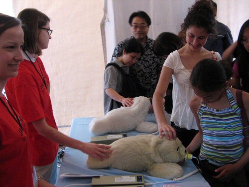 Inside the “Video Game and Robots” tent, there was a somewhat predictable gender split among the attendees.: boys and young men were huddled around the flashing, beeping game consoles; girls gravitated toward Paro, the furry white, robotic baby harp seal. The award-winning robots, which were developed by Japan’s National Institute of Advanced Industrial Science, respond to human touch, and are used for elder therapy in Japanese nursing homes and in hospitals by autistic and handicapped children.