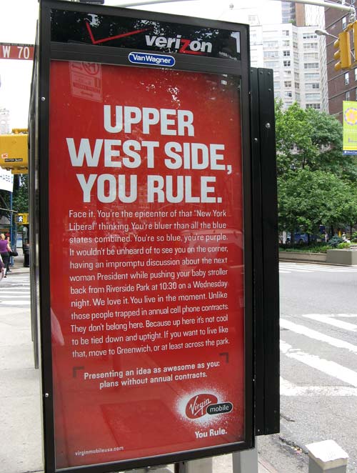 The New York Times reported on how New Yorkers are responding to the ads. (Not so well.) Virgin Mobile’s chief marketing officer is quoted saying, “We’re either equal-opportunity celebrators or equal-opportunity offenders. The reality is that we’re stirring up a dialogue and people are talking about our services.” Unfortunately, some of that talk was over amusingly misplaced ads; the one above, mocking our across-the-park neighbors as “tied down and uptight,” was inadvertently plastered on a few streets on the Upper East Side. Whoops.