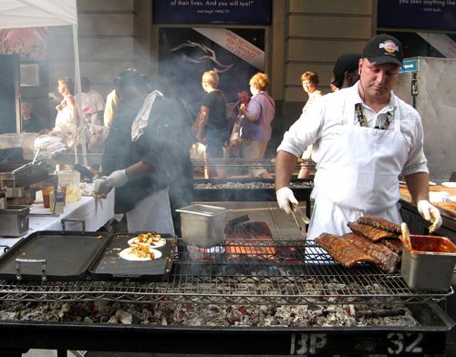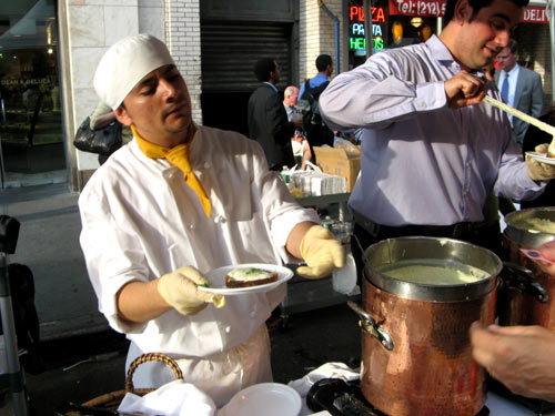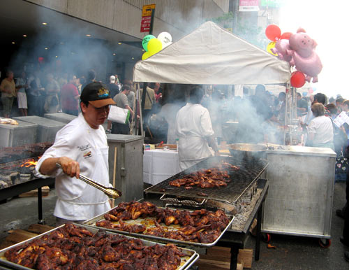 Over 50 Times Square-area eateries participated in the showcase, offering sample-sized dishes in exchange for combinations of $1 “taste tickets.” As with other outdoor food festivals around town, the combination of food samples and live entertainment drew people in droves. Here at the crossroads of the universe, the crowd was made up heavily of tourists, and the offerings represented the restaurants catering to their segment: Applebee’s, Bubba Gump Shrimp Co., Planet Hollywood, Hard Rock Café, M&M World (free samples, handed out by a giant yellow M&M)… there was even a Papa John’s (yeah, that Papa John’s) stand, where inexplicably, they seemed to be doing pretty brisk business on their $3 pizza slices, matching DiFara’s in price, but nowhere near in quality. No Olive Garden presence, but nonetheless, there was no shortage of red-sauce pasta variations. The dueling pits of Spanky’s and Virgil’s kept clouds of barbecue smoke wafting through the crowded streets, as the threat of downpour loomed overhead.