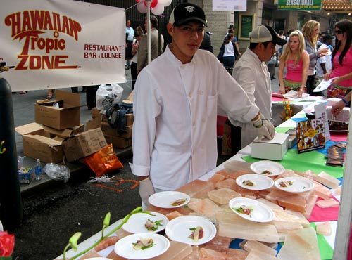 As a whole, the prices were somewhat gentler than at Dine Around Downtown – most in the 1-3 ticket range; a few “big ticket” items like Gallagher’s steak sandwiches went for $5 – probably reflecting the less rarified offerings. No foie gras or kobe beef at this festival, but there were still good eats to be had. I steered away from some of the messier, more involved dishes – no utensils please – opting for the more easily manageable bites instead. I had a tasty, if tiny, pepper-seared beef carpaccio on toast with arugula, parmesan and truffle oil from – of all places – the Hawaiian Tropic Zone stall, eye-catchingly flanked by hot pink bikini and tank-topped babes. Classy!
