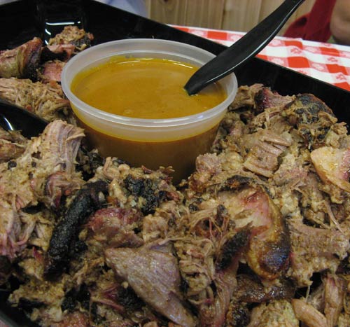 The days leading up to Sunday’s dinner was a flurry of planning – much of which, as it happens, went on behind the scenes (spearheaded by SYB) to my blissful ignorance. To SC’s disappointment, we opted not for the whole pig, in favor of the more manageable pork butt. Much has been written about this particular feast, which Daisy May’s began offering in 2005, and although personally I was not bothered by the prospect of a full pig-out, I feared the more sensitive among us would not well endure the sight of a 30 to 35-pound pig propped on the table.