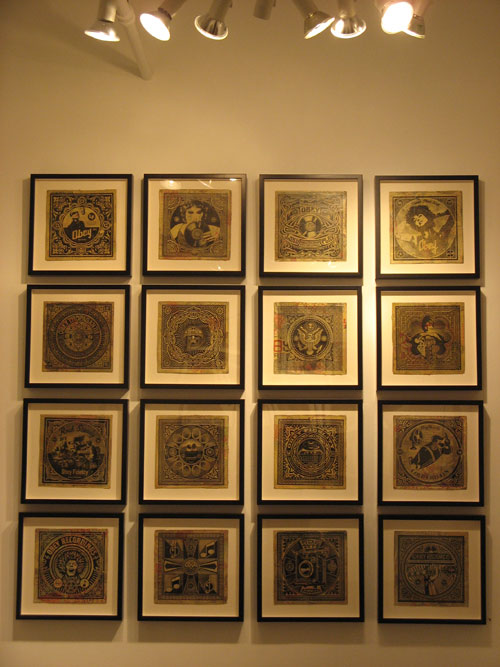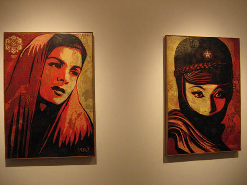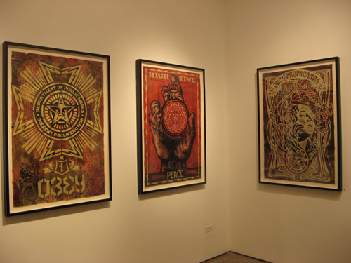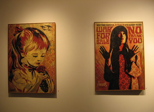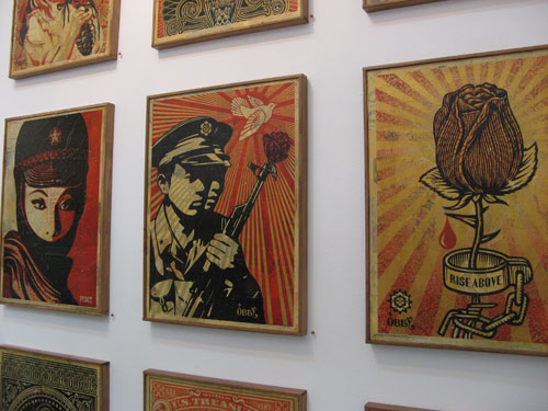 Levine was on hand to offer a brief presentation on Fairey’s works. Judging from the buzz of the crowd tonight and the ubiquitous red pushpins – indicating pieces already claimed for purchase – the show was a smash hit.