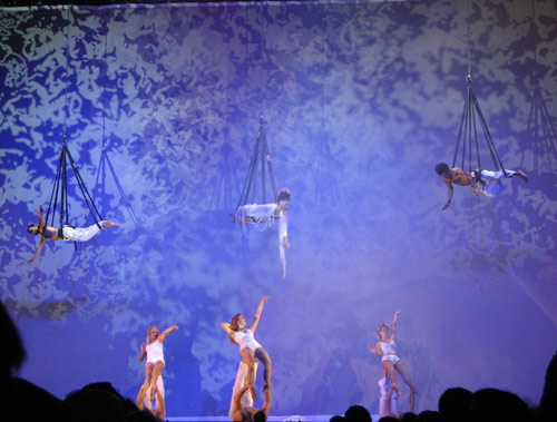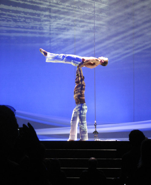 At the Hammerstein Ballroom tonight to see AntiGravity, New York City’s only aerial performance dance and acrobatic company, created by Christopher Harrison in 1990. This was to be the troupe’s hometown stop of their national tour: a variety show of gymnasts, modern dancers, circus acrobats and stunt artists, set to a blaring, pounding soundtrack of techno, dance and Top 40.
