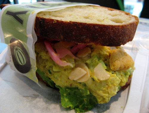 J and I split a curried chicken salad sandwich, which was hands down the best chicken salad sandwich I’d ever had — in a mall or otherwise. Thomas Keller – of Yountville’s French Laundry and Ratatouille fame – elevated this simple café fare with his focus on fresh, premium ingredients. The gourmet version of our sandwich was made up of tender chunks of roast chicken, studded with golden raisins and toasted almonds, and served on hummus-spread fennel semolina bread, with romaine lettuce, pickled red onions and a side of cornichons.
