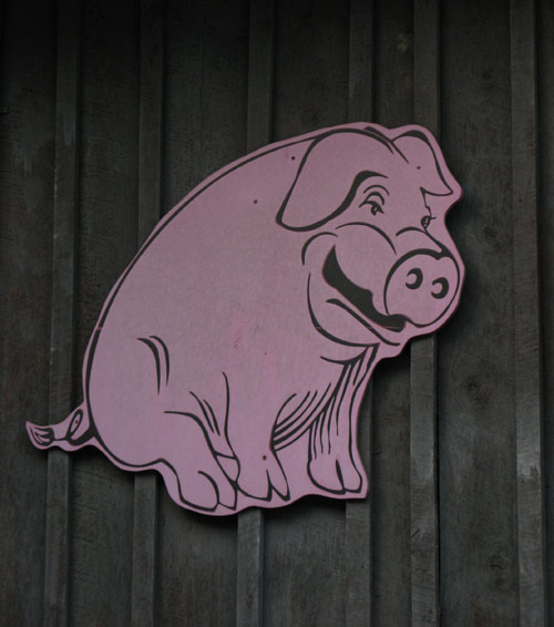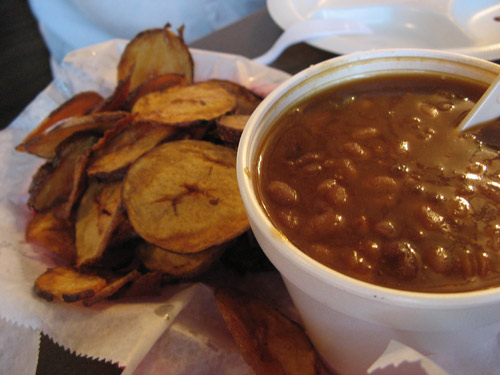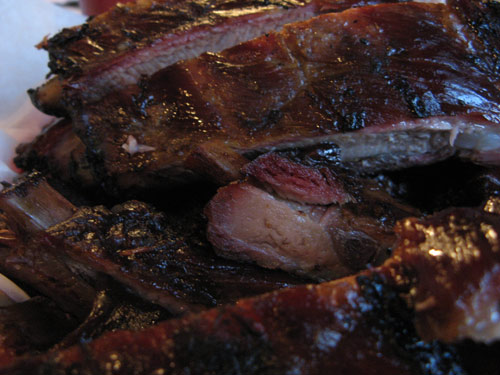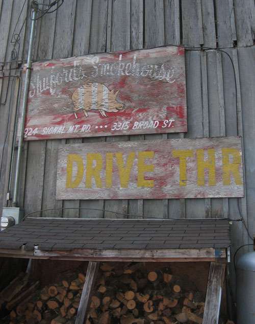 We splurged on the Family Pack Ribs for 4, with sides of tater logs (thin-sliced skin-on potatoes, deep fried) and baked beans (with chunks of bacon… of course.) The lemonade was delicious with bits of actual pulp; we were told by the cashier/owner’s daughter that it’s fresh-squeezed daily. Shuford’s own special barbecue sauce — in regular and hot varieties — is made from scratch, every other day. She had come over to our table in part to check on us, and in part (we suspected) to figure out just what our story was, since she had spotted us taking copious photographs outside before dinner. (We told her that we were from New York City, which seemed to explain a lot.)