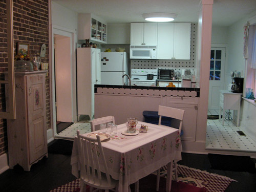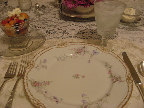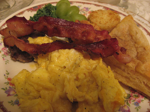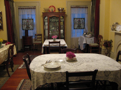 Early the next morning, we were greeted with fresh, hot coffee set out on a silver tray outside our room, to ease us into the morning until the hearty breakfast prepared by Carolyn would be served in the dining room. Fresh fruit salad topped with real whipped cream, eggs — or is that “aigs”? — and bacon, a homemade apple turnover, and a currant scone, but disappointingly, no beaten biscuits. In their stead, we got what turned out to be (after J just had to ask) a round cut-out of cake, buttered and pan-toasted. Now that’s brilliant.