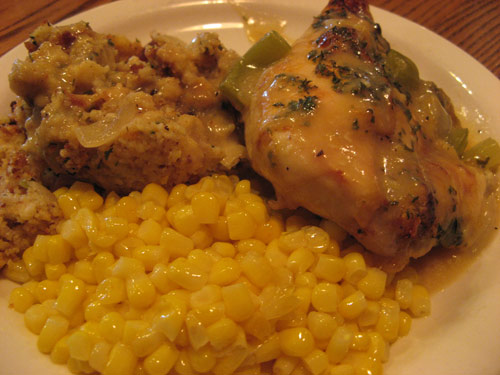 One of the last opportunities for “a glass o’ sweet” and “vegetables” like Monday’s special “cornbread dressing.” (Yes, I had both.)