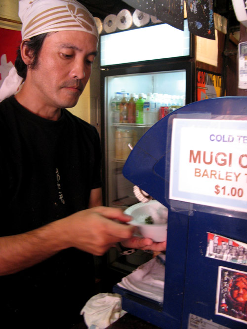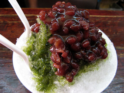Shaved ice is a treat popular in Southeast Asia: in Hong Kong, it’s “bao bing”; in Korea, “pat bing soo.” Malaysians refer to it as “ice – or ais – kacang,” or simply “ABC” (air batu campur). I like to think of it as the Asian version of a snow cone, though the consistency is a little different: a mound of thinly flaked (not crushed) ice, topped with combinations of ingredients like condensed milk, chopped fruits, sweet corn, grass jelly, or here at Otafuku: green tea syrup and sweet red beans. (Strawberry and melon flavors are available, too.)