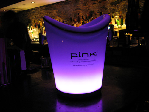 But tonight: the party to build the anticipation for the main event. The clothes themselves were represented by designers’ sketches, hung up on walls around the lounge. M and I wandered among the pretty people, as we sipped on pretty p.i.n.k. drinks. The spirit is the brainchild of David Mandell, who in 2004, launched this plain Dutch vodka infused with caffeine and Brazilian guaraná plant extract, to capitalize on the popularity of energy drink and vodka combinations. Mandell’s end product is intended to produce the same energizing effect as a Vodka Red Bull without all the extra sugar; one serving of 80 proof p.i.n.k. contains about 80 mg of caffeine, or the equivalent of a small cup of coffee. Just the fuel to keep us partying through the night.