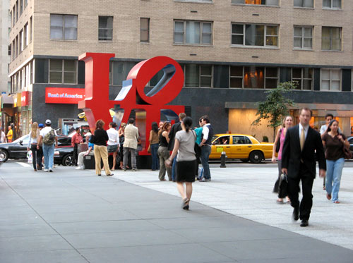 Other editions of this famous sculpture have found their home around the world — including in Vancouver, Bilbao, Tokyo, Jerusalem, Singapore, Vegas, Philadelphia, New Orleans and Indianapolis — where the sentiment has been translated into Spanish, Chinese and Hebrew. Also in a multitude of colors: while the edition on New York City’s Sixth Avenue is of Indiana’s most commonly rendered red and blue, other colored editions include blue and green and red, white and blue.