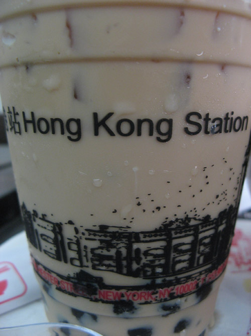 This time, mostly because I hadn’t had one in a long time, I even allowed the cheery cashier to upsell me on a cup of bubble milk tea — an add-on which effectively doubled the price of lunch, since the lai fun noodle base was $1.50, and additional toppings just $1 each. Hong Kong Station actually has quite an impressive selection of drinks of the variety one rarely sees at Chinatown noodle shops. In addition to the aforementioned bubble teas, they offer bean and fruit ices, Horlicks, almond drink, honey water, lemon Coke, lemon Ribena, lemon coffee (hmm… and possibly: ick) and “salty lemon 7-Up” (ditto.)