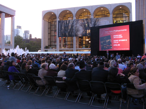 At showtime, there were more opportunities for the plebes to take part in the event, as 1,000 chairs were set up on the Lincoln Center’s plaza for a free, live broadcast of the concert, sponsored by the Philharmonic’s new (and first) exclusive global sponsor, Credit Suisse. Thousands more eventually filled the standing room only slots, or caught the simulcast on PBS.