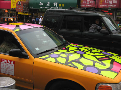 I’ve been spotting these flower-decaled cabs all around town this month – part of temporary, mobile public art project “Garden in Transit,” which celebrates the 100th anniversary of New York’s first motorized taxicab. 23,000 children and adults, drawn mostly from the city’s public schools, hospitals and youth programs, participated in the Portraits of Hope creative therapy program. The massive project of painting the flowers on adhesive weatherproof panels to be applied to the hoods, roofs and trunks of an estimated 13,000 of the city’s yellow cabs began last September; negotiations with city officials for the deployment began six years earlier. Owners volunteer their cabs for the project; individuals can sponsor cabs for $500 apiece, which includes a signed certificate with the cab’s medallion number.