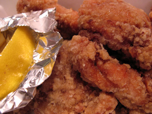 We’d been trying to compare this Japanese version against the Korean fried chicken since Labor Day when the shop’s holiday schedule thwarted our initial attempt. This time, there were no such snafus. After calling in our order from the apartment, JG set out for 19th Street ten minutes later for the strategic pick-up of our food, fresh from the fryer.