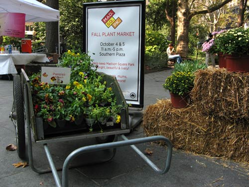 The Madison Square Park Conservancy’s annual Fall Plant Market — one of two that take place during the year — was set up on the southern plaza, near the park’s fountain, this afternoon. After our burgers, we waddled over to take a peek at the seasonal flower and plant offerings. Proceeds benefit the Conservancy.